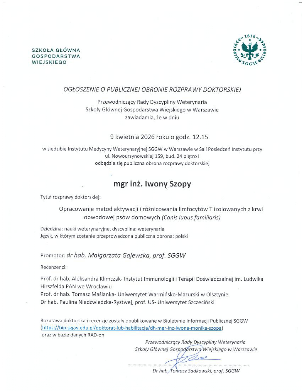 Ogłoszenie o publicznej obronie rozprawy doktorskiej lek wet. Joanny Turniak