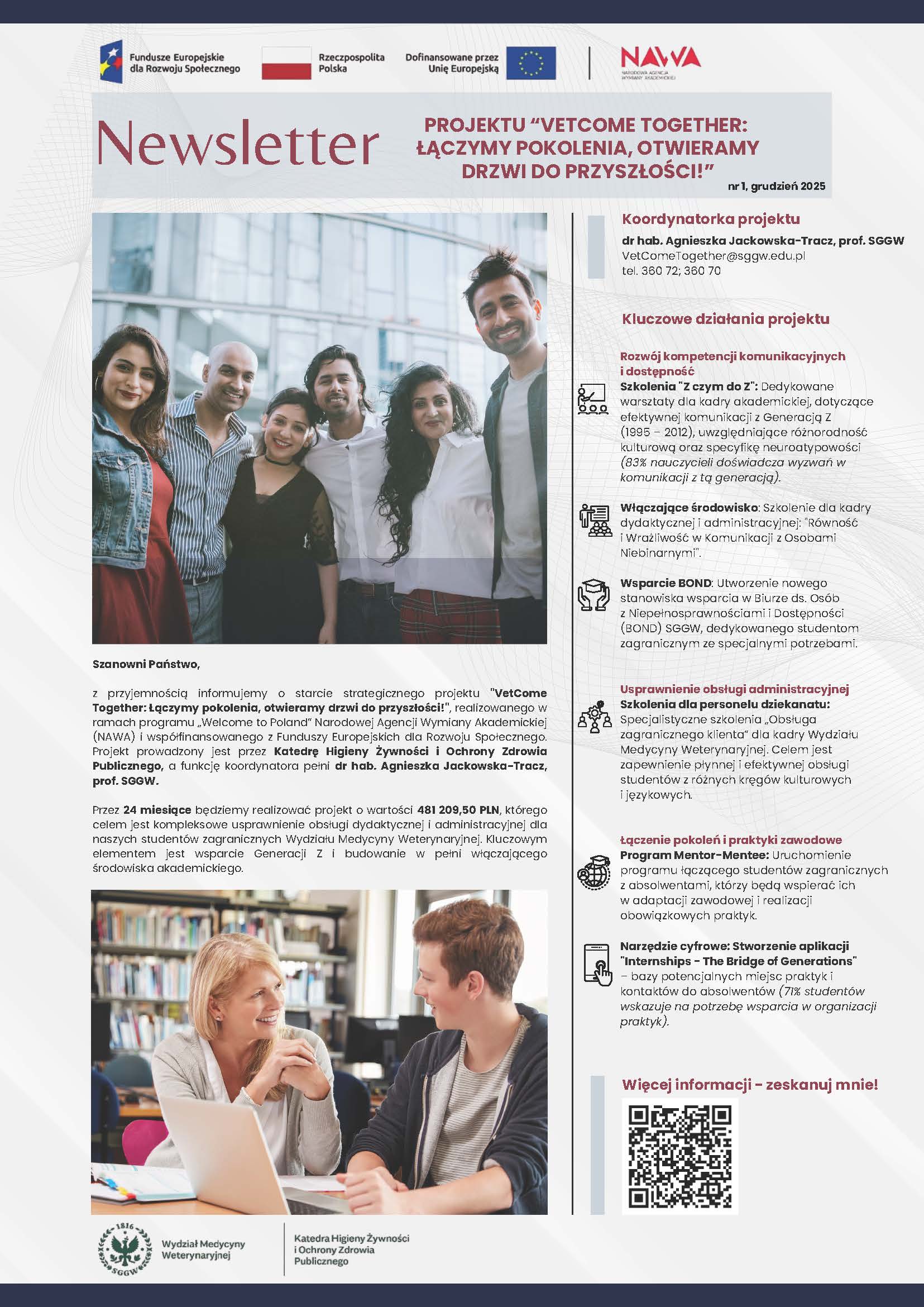 PL: Drugi numer newslettera projektu „VetCome Together” prezentuje bieżące działania realizowane w ramach programu NAWA „Welcome to Poland”, w tym wsparcie studentów zagranicznych oraz inicjatywy na rzecz dostępności. EN: The second issue of the “VetCome Together” newsletter presents ongoing activities implemented under the NAWA “Welcome to Poland” programme, including international student support and accessibility initiatives.